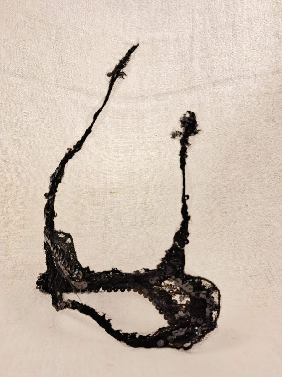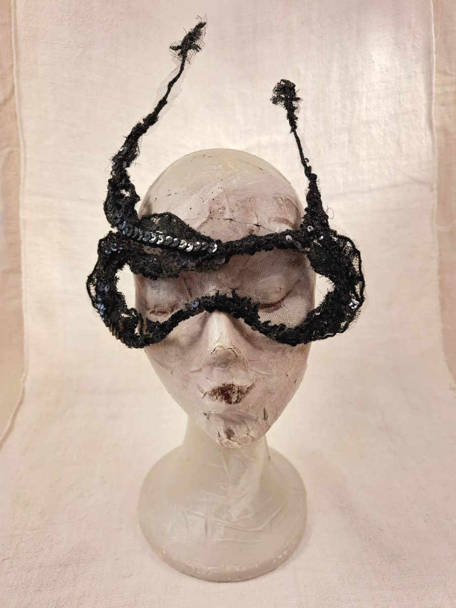 Antifaz realizado en alambre recubierto de encaje cosido con lentejuelas.
