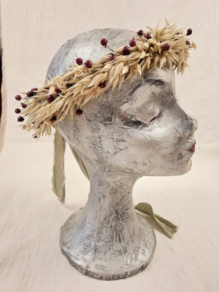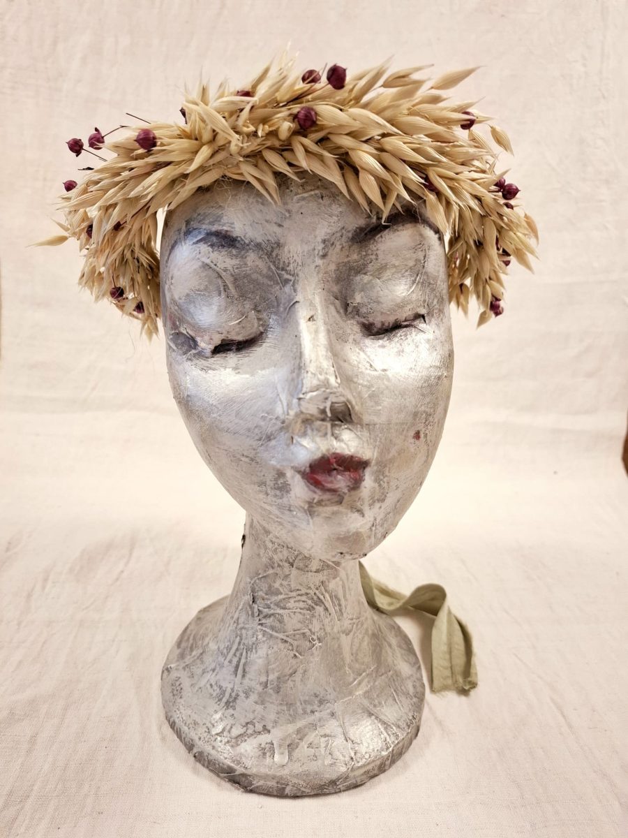 Compuesta de avena con ligero tono verdoso y semillas de lino tono borgoña. Lazo verde desilachado para ajustar.