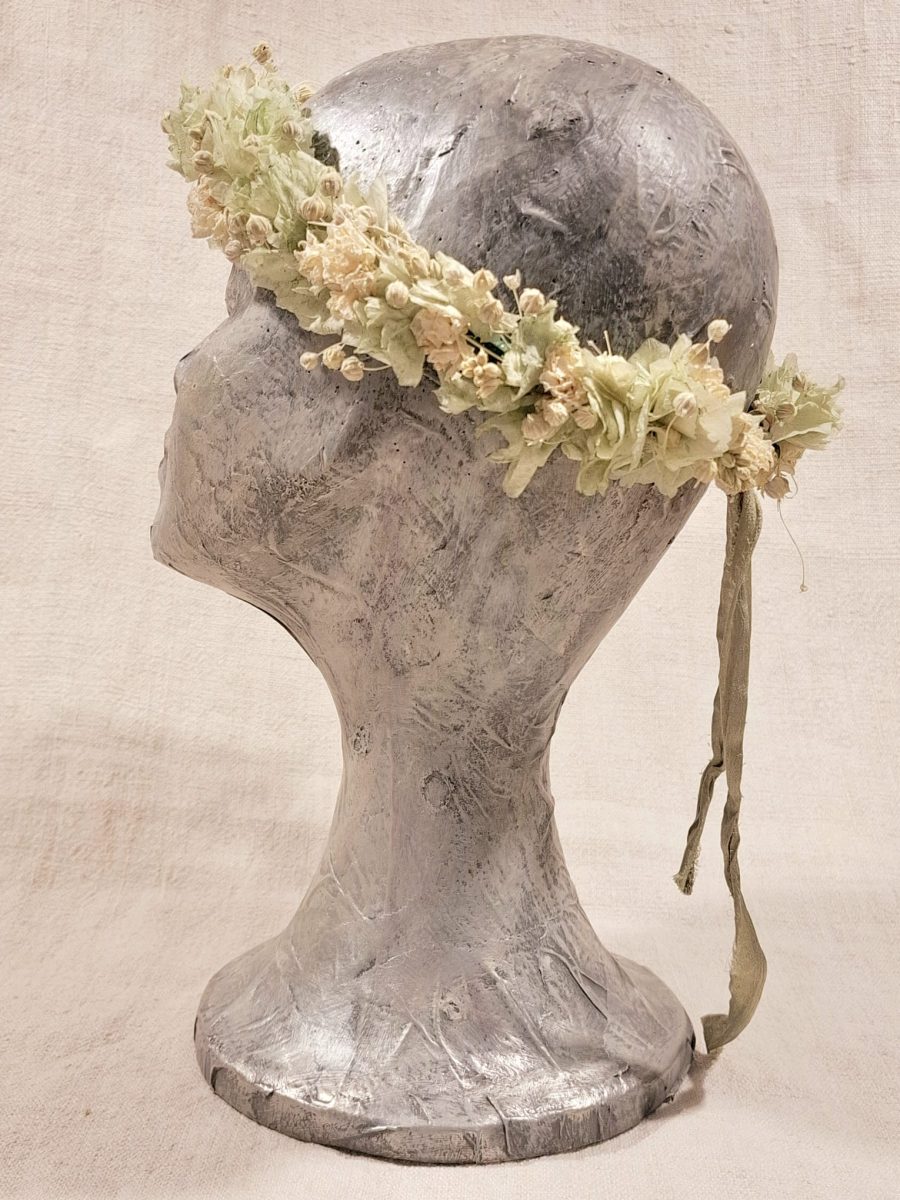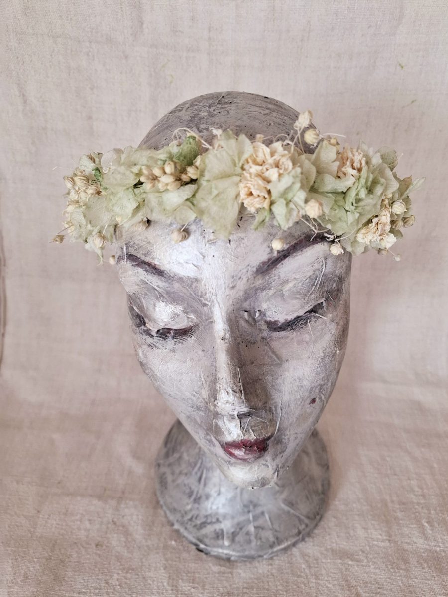 Composición: lino y delphinium seco color crema y hortensia preservada color verde mentolado.