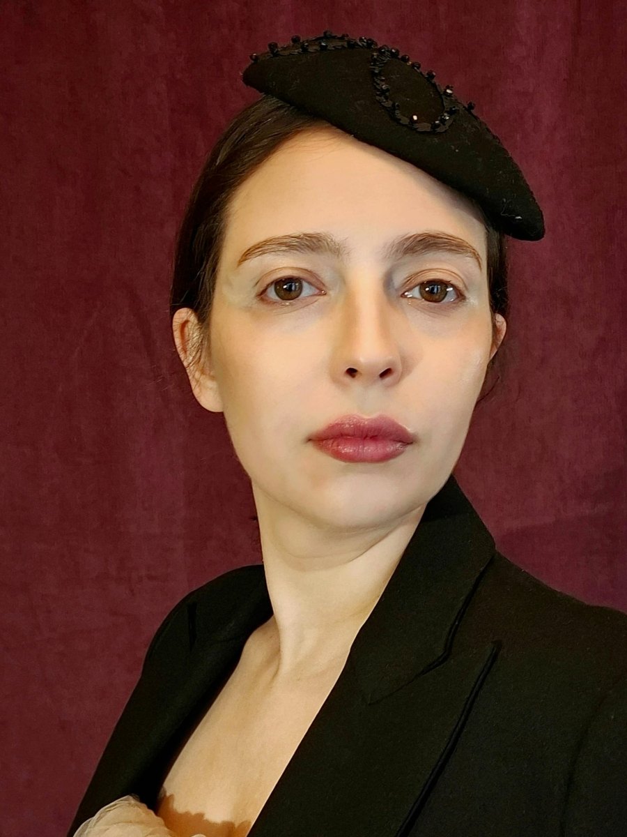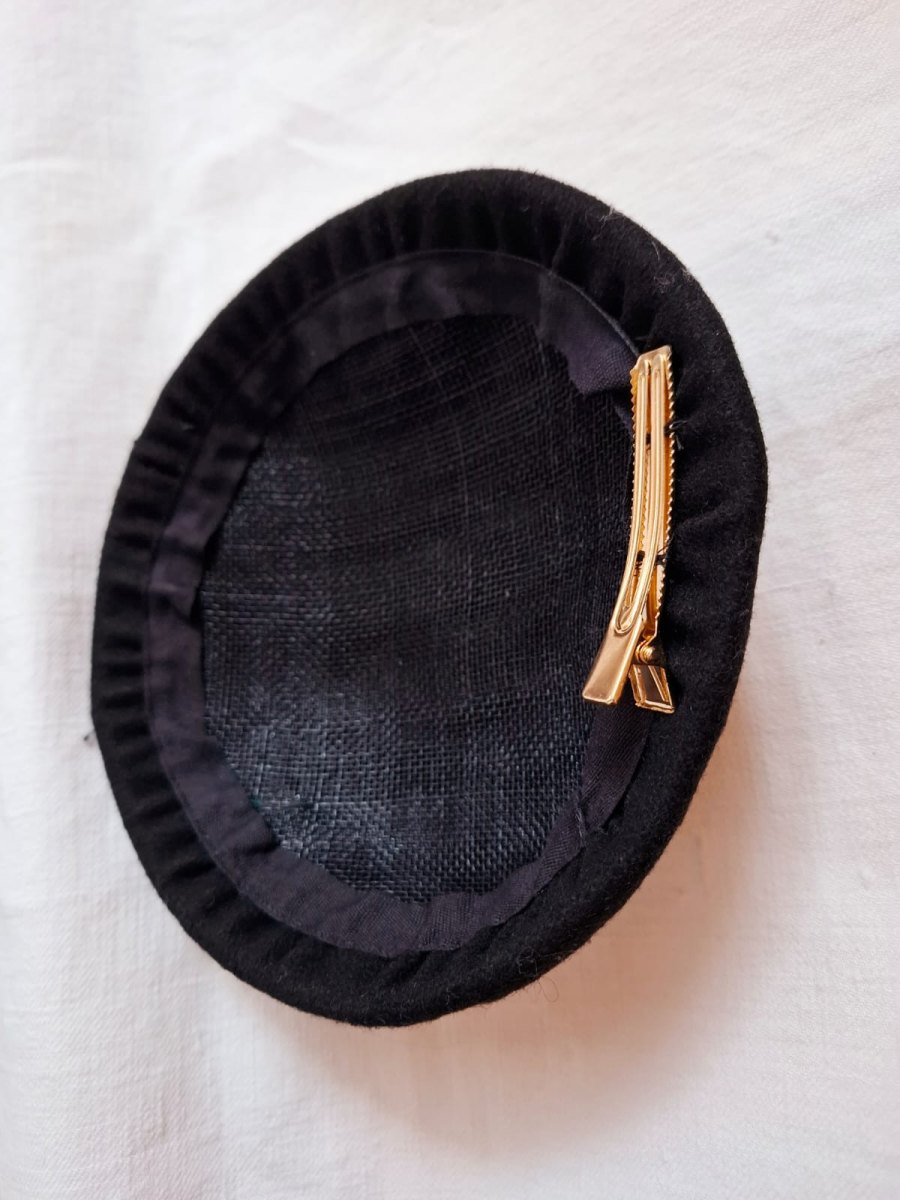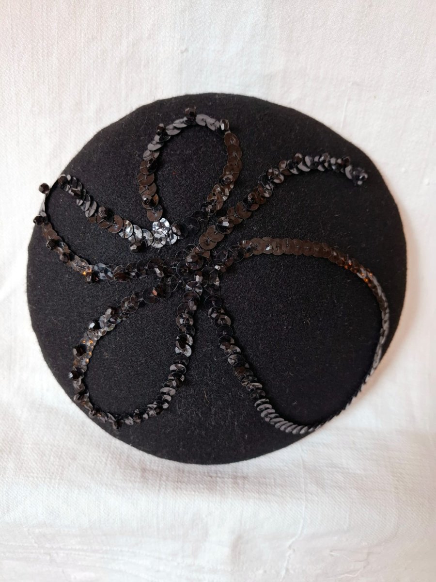 Moldeado en cabeza de maniquí. Sobre ella dibujo de lentejuelas en forma de flor con piedras cosidas para dar relieve.
